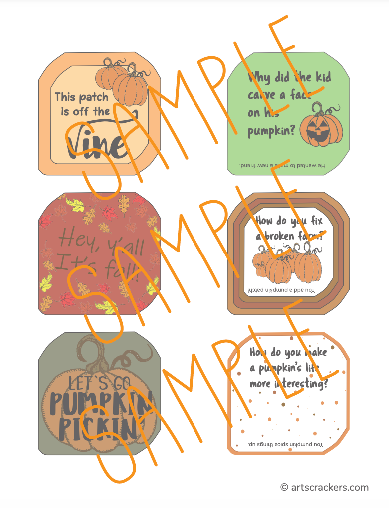 • 1 PDF file, 2 pages: (1) set of 6 lid labels with cute sayings and kid-friendly fall jokes to cut out, (1) page of name labels to cut out